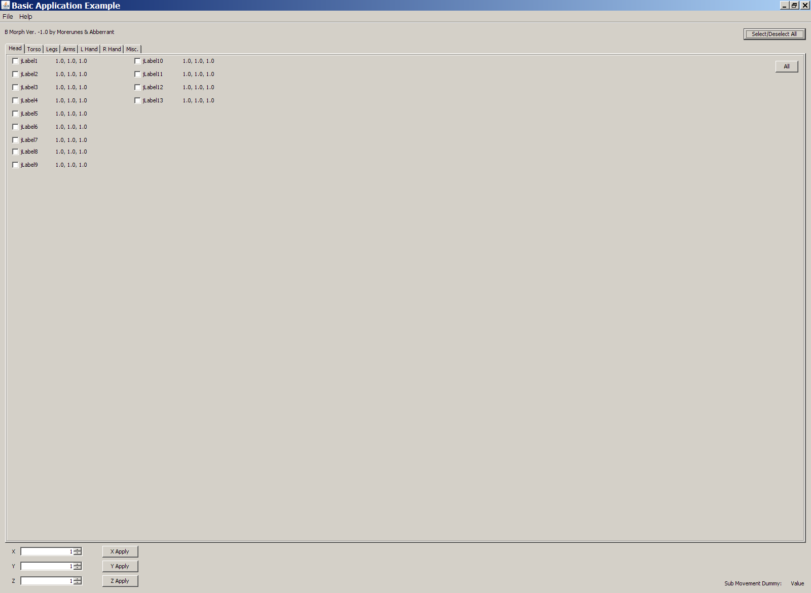 As I said, you might not have to worry about the sub_movement_dummy, as it could be automatically calculated. You check the parts you want to change the size of, then enter the number in the number box and click apply. Then you will want to save a b-morph file, and export the bones over your hero's bones.