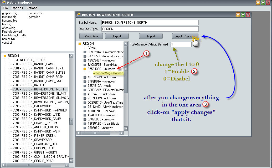 FE should only be editing REGION entries, just flipping some 1s to 0s. FE should then recompile the game.bin, then start Fable.