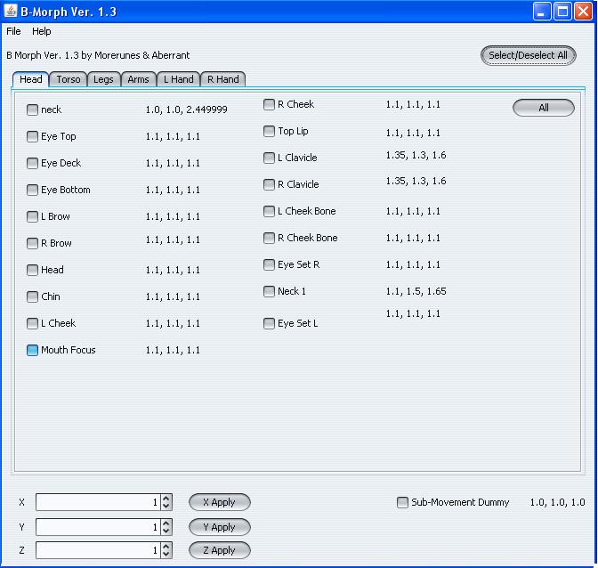 After that, go through checking boxes with similar numbers and turning down the x and y values (check the box, then set the x and y values to be a little less than they were). Do it for any bone you wish to adjust, don't mess with Sub-Movement Dummy unless you make him shorter.