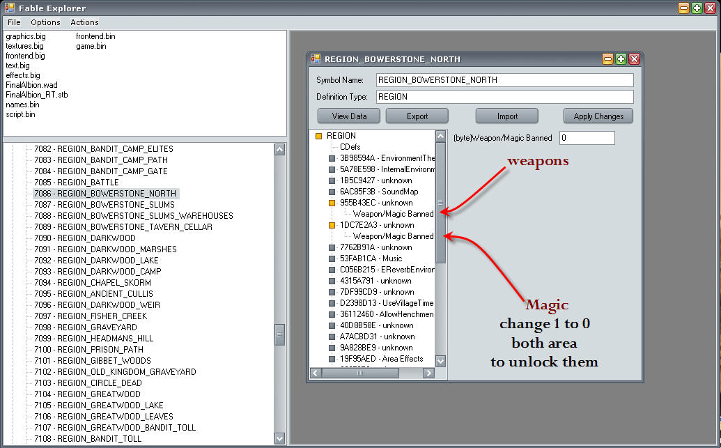 FE should only be editing REGION entries, just flipping some 1s to 0s. FE should then recompile the game.bin, then start Fable.