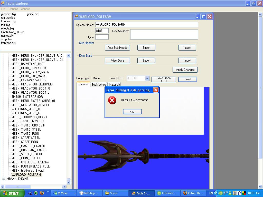 hey i exported a model with wow model vewer and used milkchape to export it to a .x file but i get this error message when i try to open it itn fable explorer