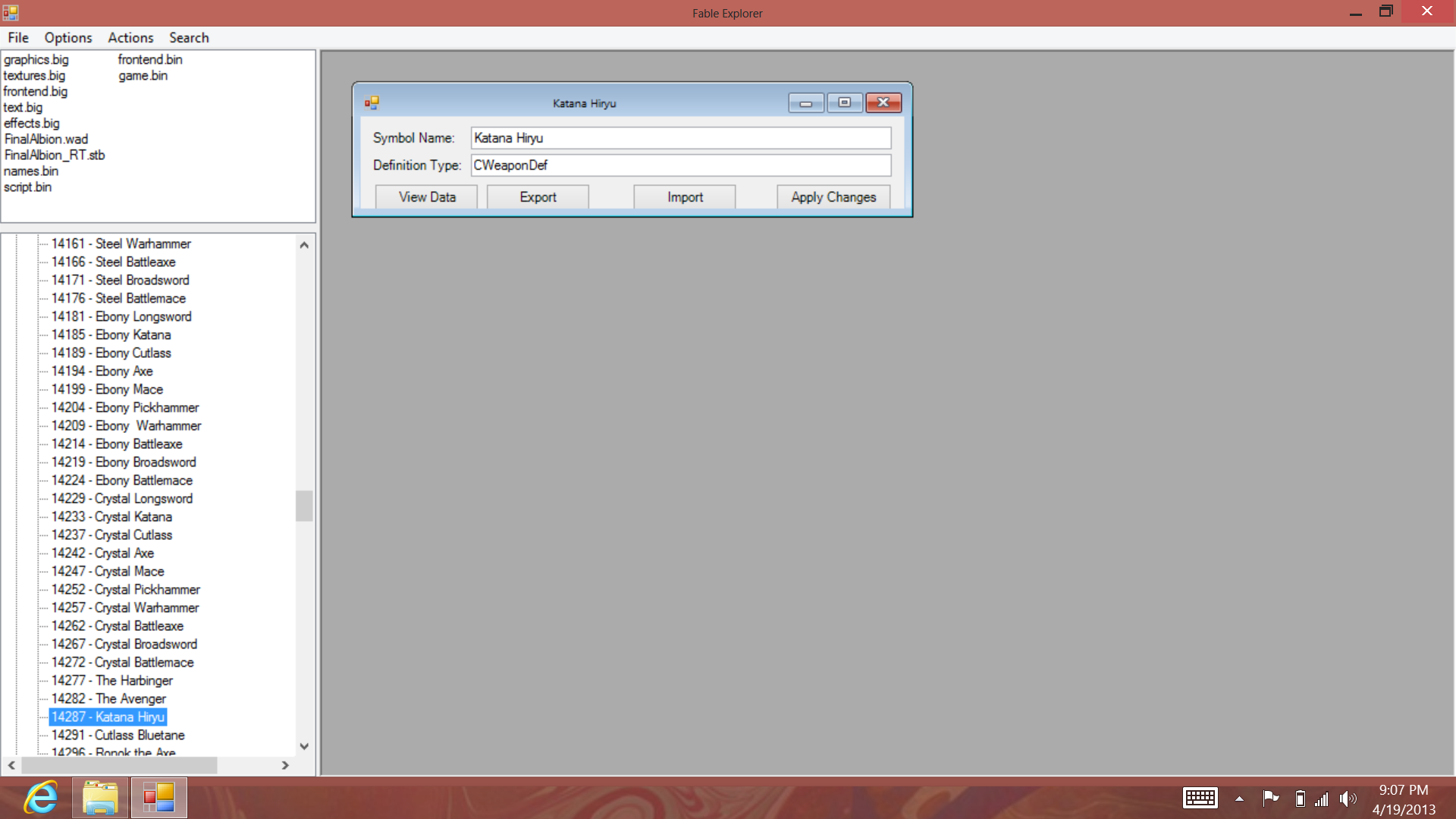 Ok, forgive me while I try to narrate my problem. On my pc a few years ago, I learned about modding fable. To make things easy, I gave symbol names to everything I changed. I did this to weapons and CShopdefs. I changed weapon sizes, damages, and rearranged who sold what grade of weapons. Two weapons (and only these two entries) then came up with window "Error Parsing Entry" reading "Control bytes mismatch. ID=B27A08D" with a button "OK" that opens the window in the screenshot (sorry I don't know how to make spoilers so see Screenshot (1).png at bottom). After installing Fable onto my tablet, I moved the old "data" folder over to it and had the same problem. Since then I have removed Shadownet, uninstalled Fable, deleted all Fable/Shadownet related files, reinstalled the program and def.xml and Fable multiple times, and still have the same problem. I tried to override the problem by creating FMPs with symbol name changed from a different device, but where entries matched, nothing changed, and where they didn't match new entries with the different names were added. And now the question(s). How do I fix the Parsing Errors and/or how do I wipe Shadownet's memory so I can work with working entries.